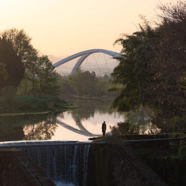 Hai vòm thép đối xứng xác định cây cầu này do kiến trúc sư Zaha Hadid thiết kế, trải dài 295 mét bắc qua một nhánh của sông Đà Giang ở Thành Đô, Trung Quốc.