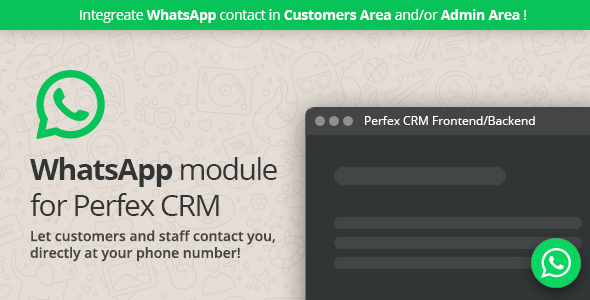 Mô-đun WhatsApp đối với Perfex CRM, là mô-đun cho phép bạn tích hợp nút liên hệ WhatsApp nổi tiếng vào Khu vực khách hàng> và/hoặc Khu hành chính của Perfex CRM.