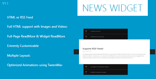 Widget Tin tức là một plugin jQuery có thể biến bất kỳ danh sách hoặc tin tức nào thành thanh trượt tin tức. Plugin cực kỳ tùy biến với hơn 28 tùy chọn. Tệp này bao gồm tùy chọn Đọc thêm toàn trang và tiện ích Tùy chọn đọc thêm. Bạn cũng có thể sử dụng plugin này với bất kỳ nguồn cấp dữ liệu RSS nào.